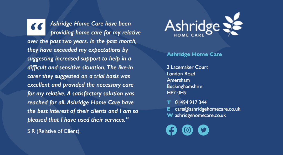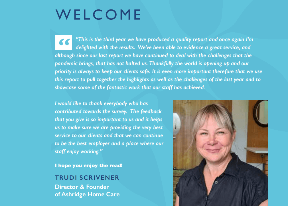 Blue background with a white leaf logo and the text "Ashridge Home Care." Below, green text reads "Annual Quality Report 2022."
